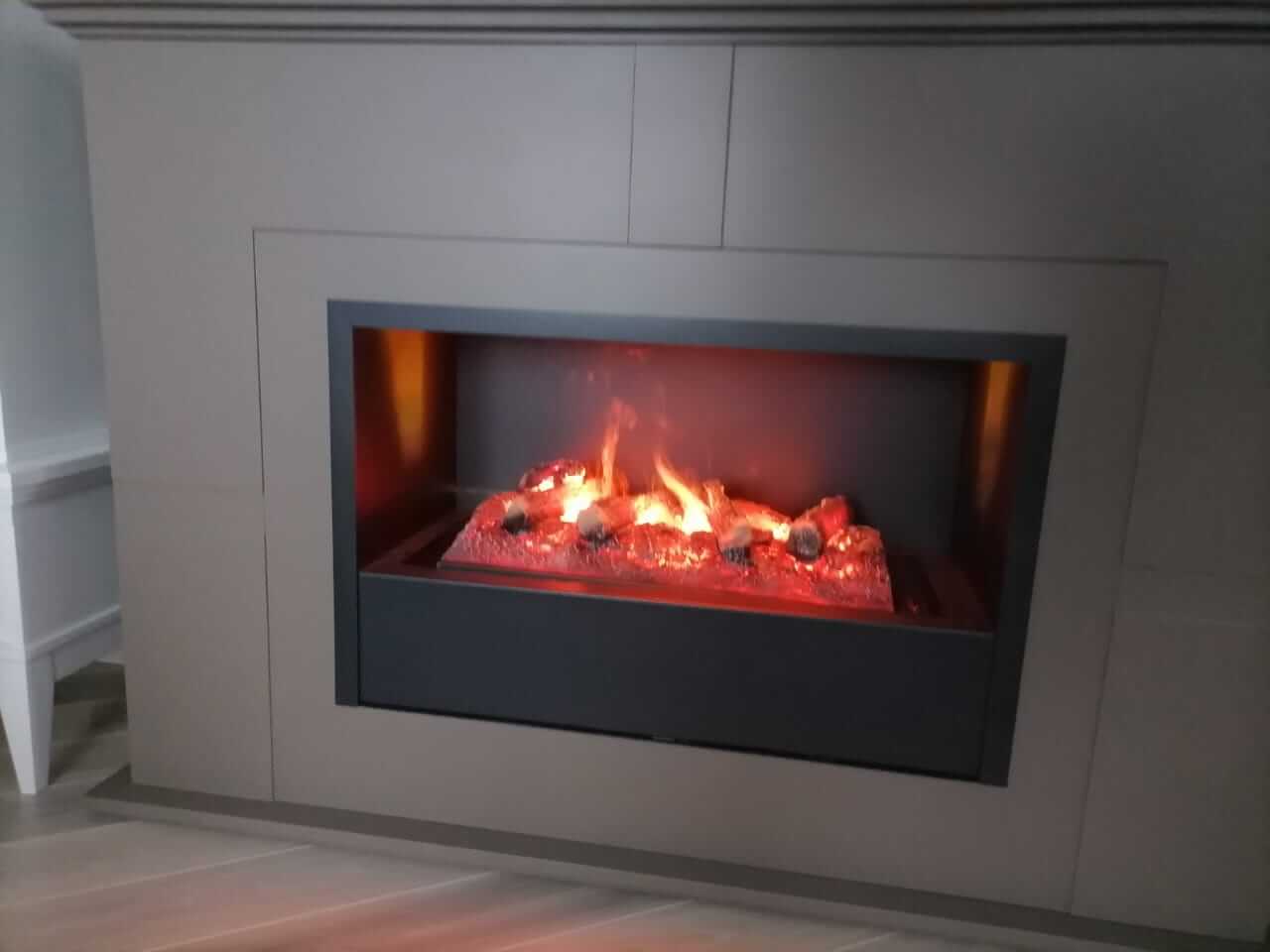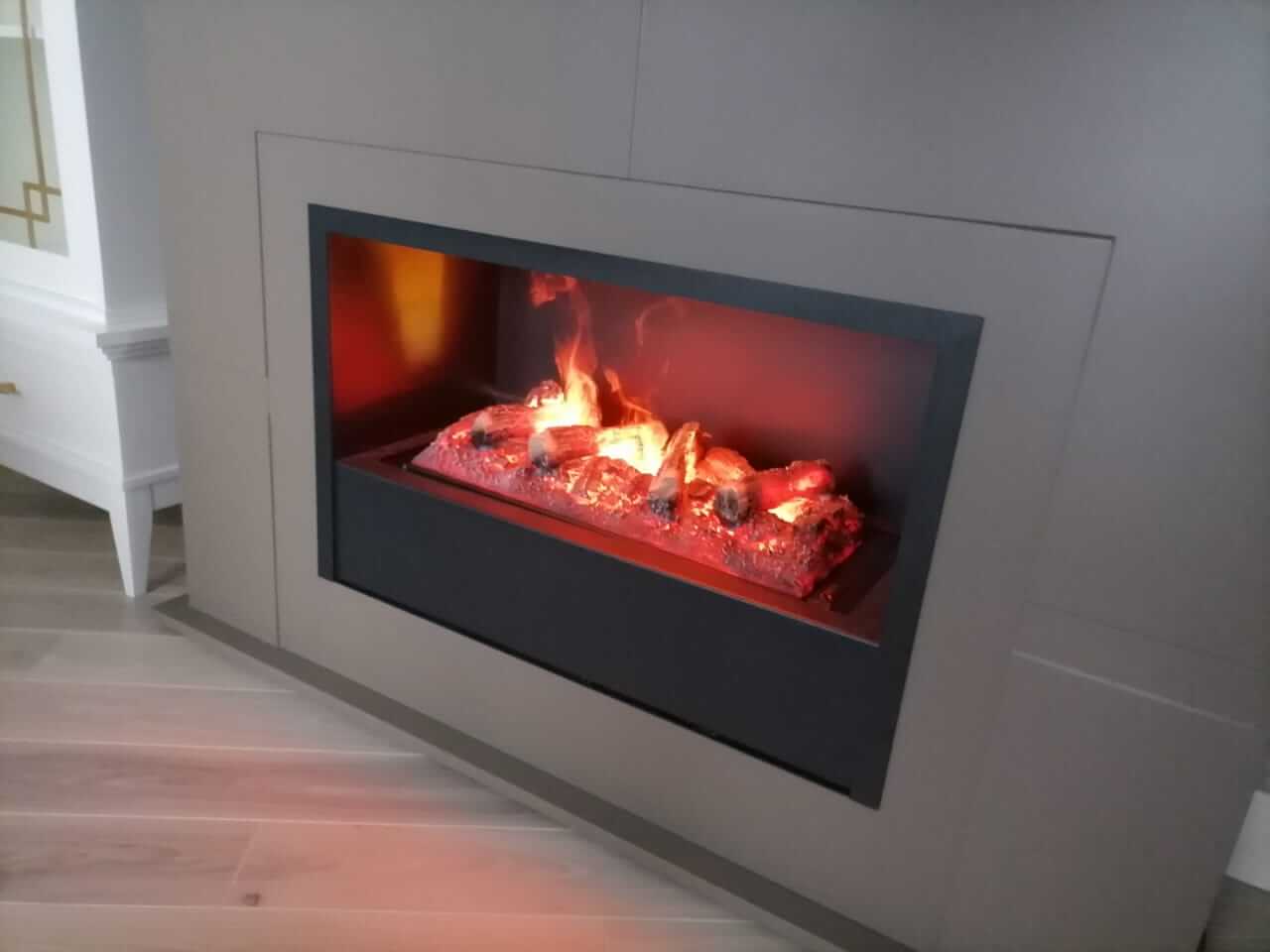 Установка камина с индивидуальным изготовление портала, под паровую кассету Real Flame с реалистичным потрескиванием дров. Очаг от нашего производства Firezo.