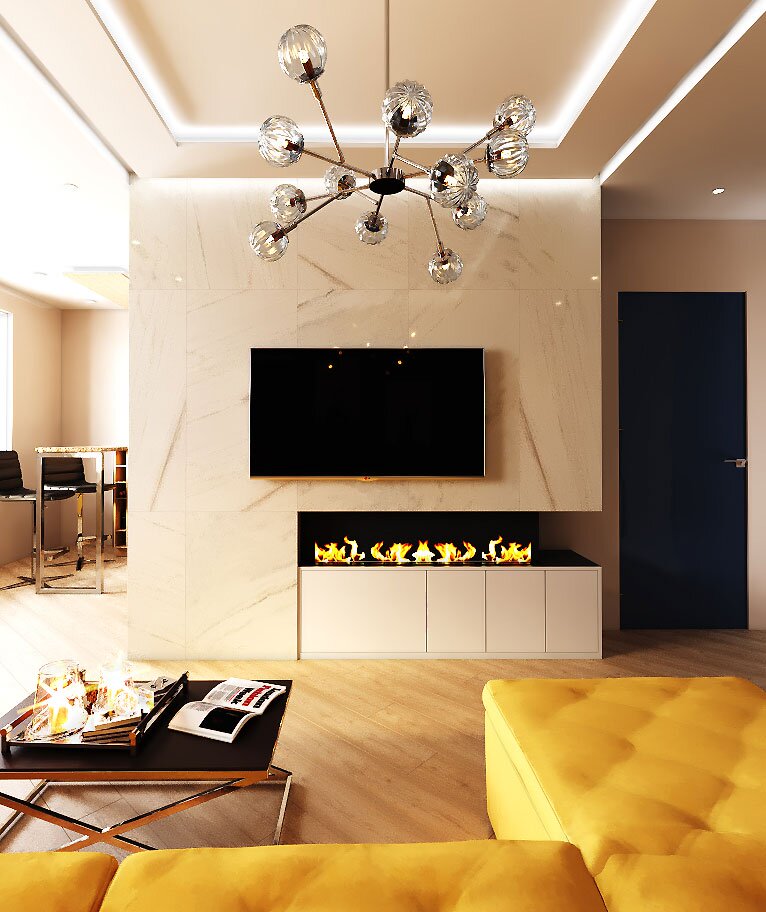 По проекту дизайнера Юлии Яковлевой, запланирован угловой биокамин встраиваемый в мебель из МДФ. Над камином будет расположен телевизор. Для такой компоновки идеально подходит угловой биокамин, потому что корпус камина открыт с двух сторон и часть тепла образовавшаяся при работе камина будет отводится не только с лицевой части, но и сбоку.