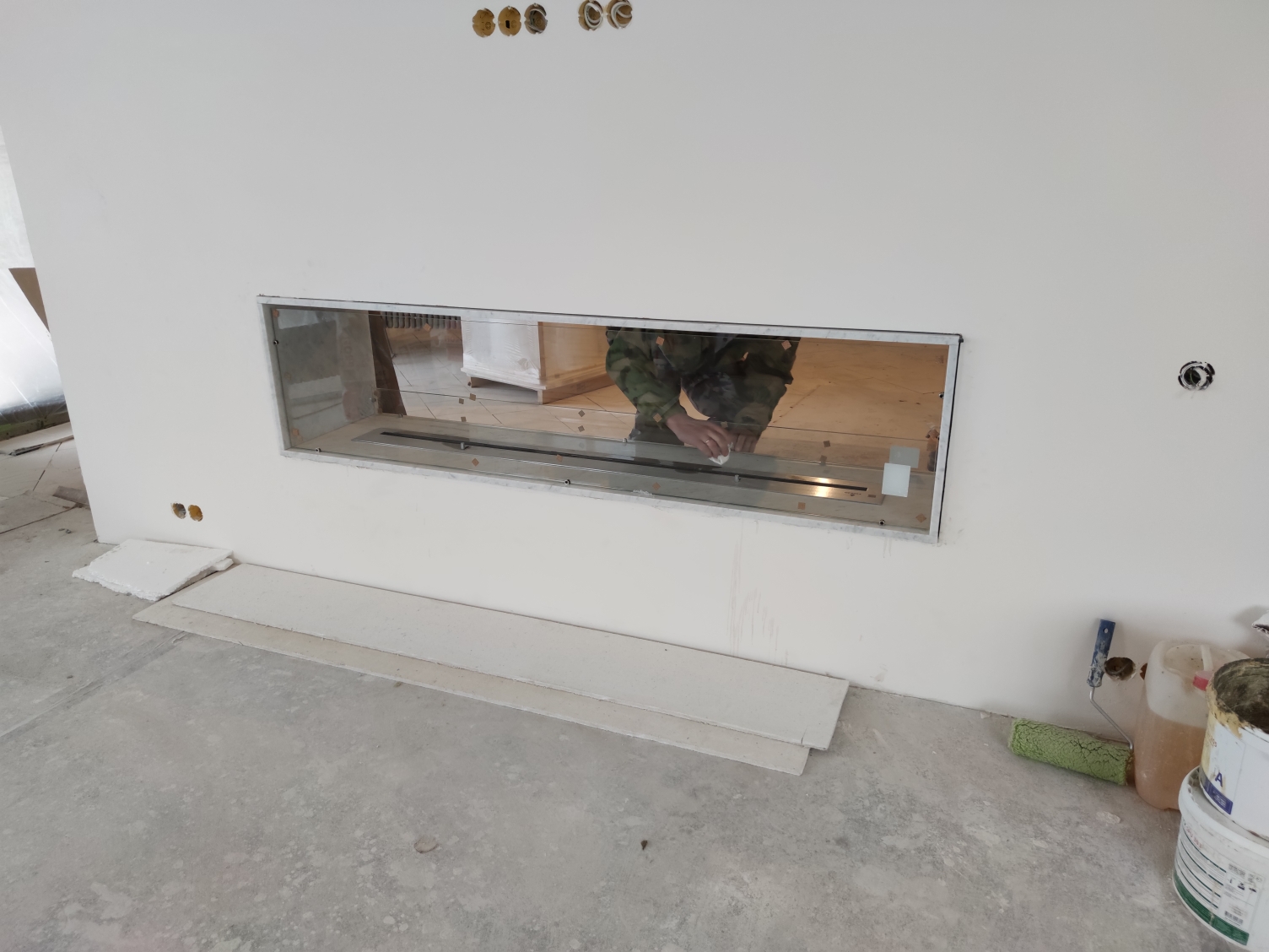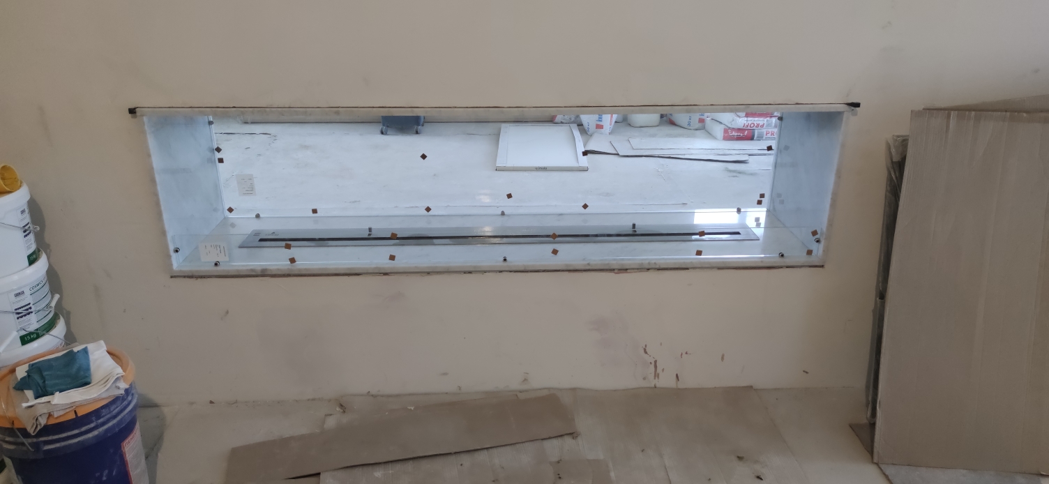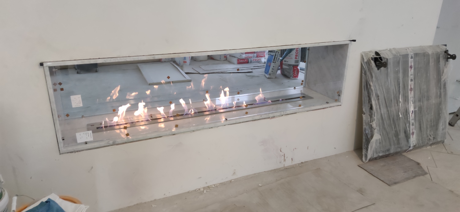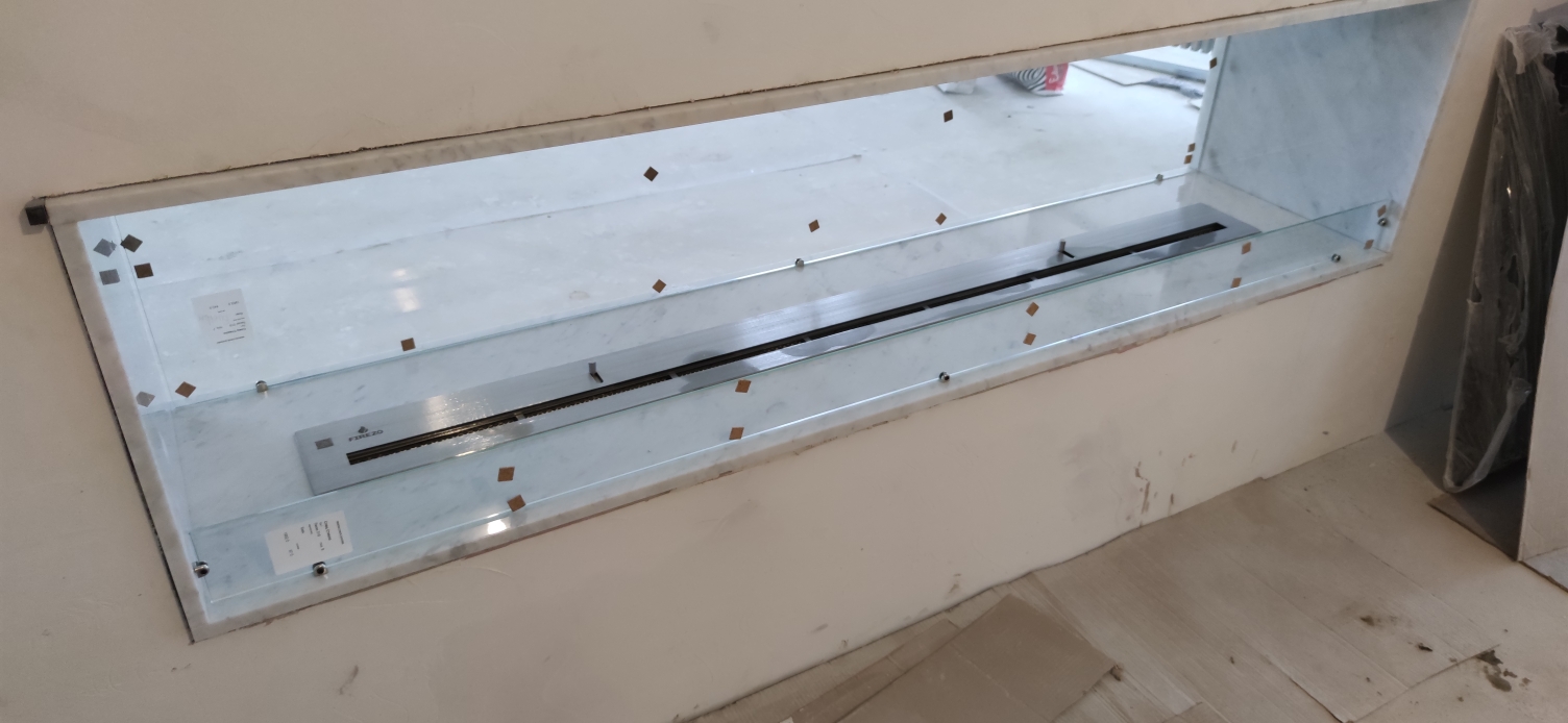 Встраиваемый биокамин в мраморном сквозном портале Материал портала: Мрамор Carerra Bianco толщиной 2 см Длинна 2000 мм высота 400 мм Длинна линии огня 1700 мм Топливный блок Firezo 1700 Для жесткости конструкции делали несущую раму на которую вклеивали мрамор Одна сторона закрыта совсем закаленным стеклом во всю высоту. Работа заняла месяц, но можем и быстрее. Посмотрите видео, что получилось